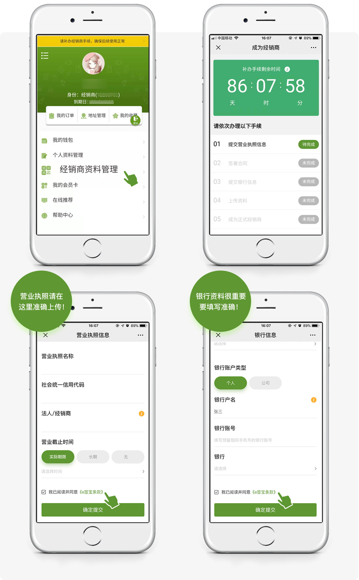 登陆账号,点击“经销商资料管理”完善个人资料。所有信息都要依次,准确填写完整。